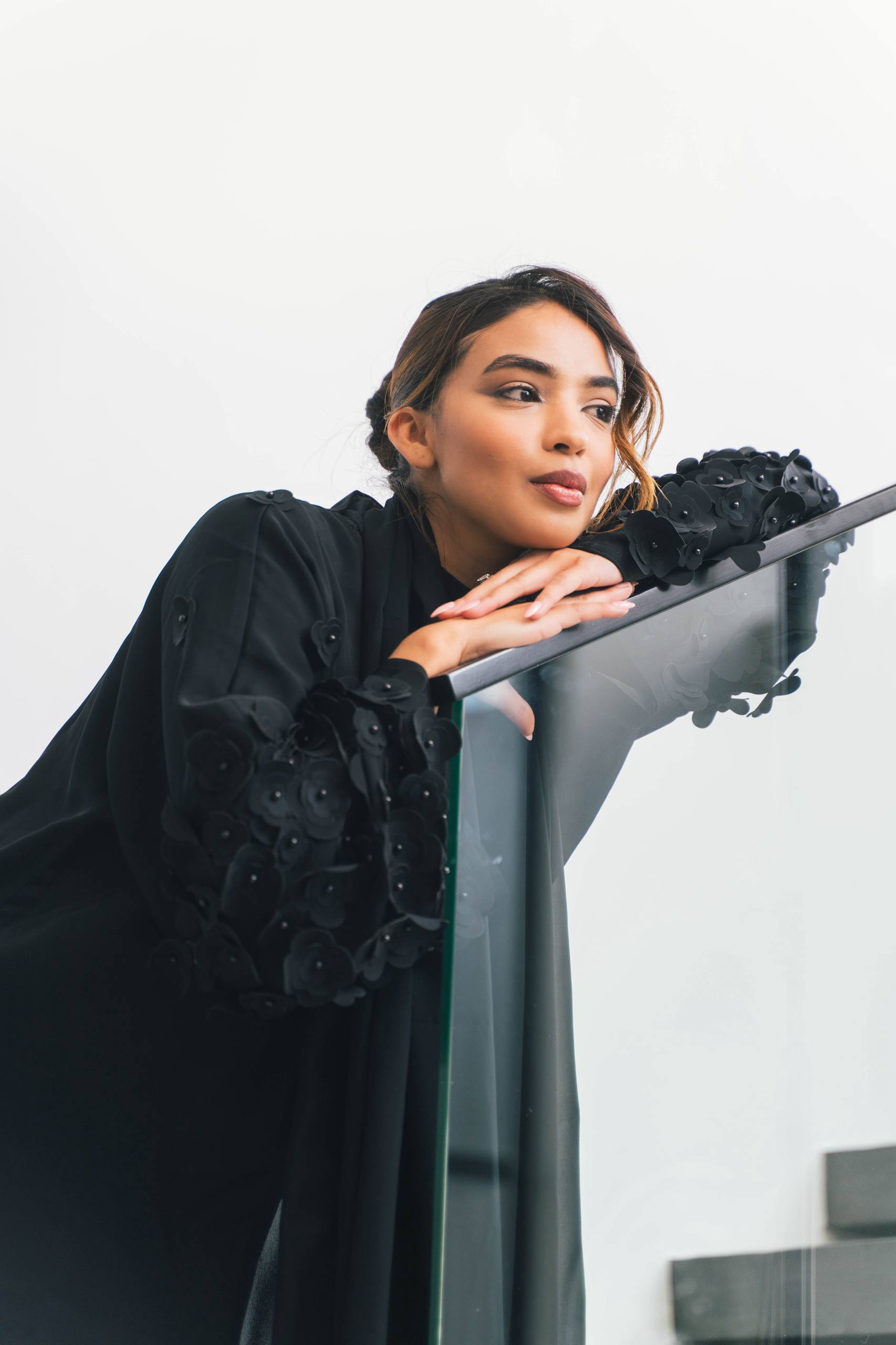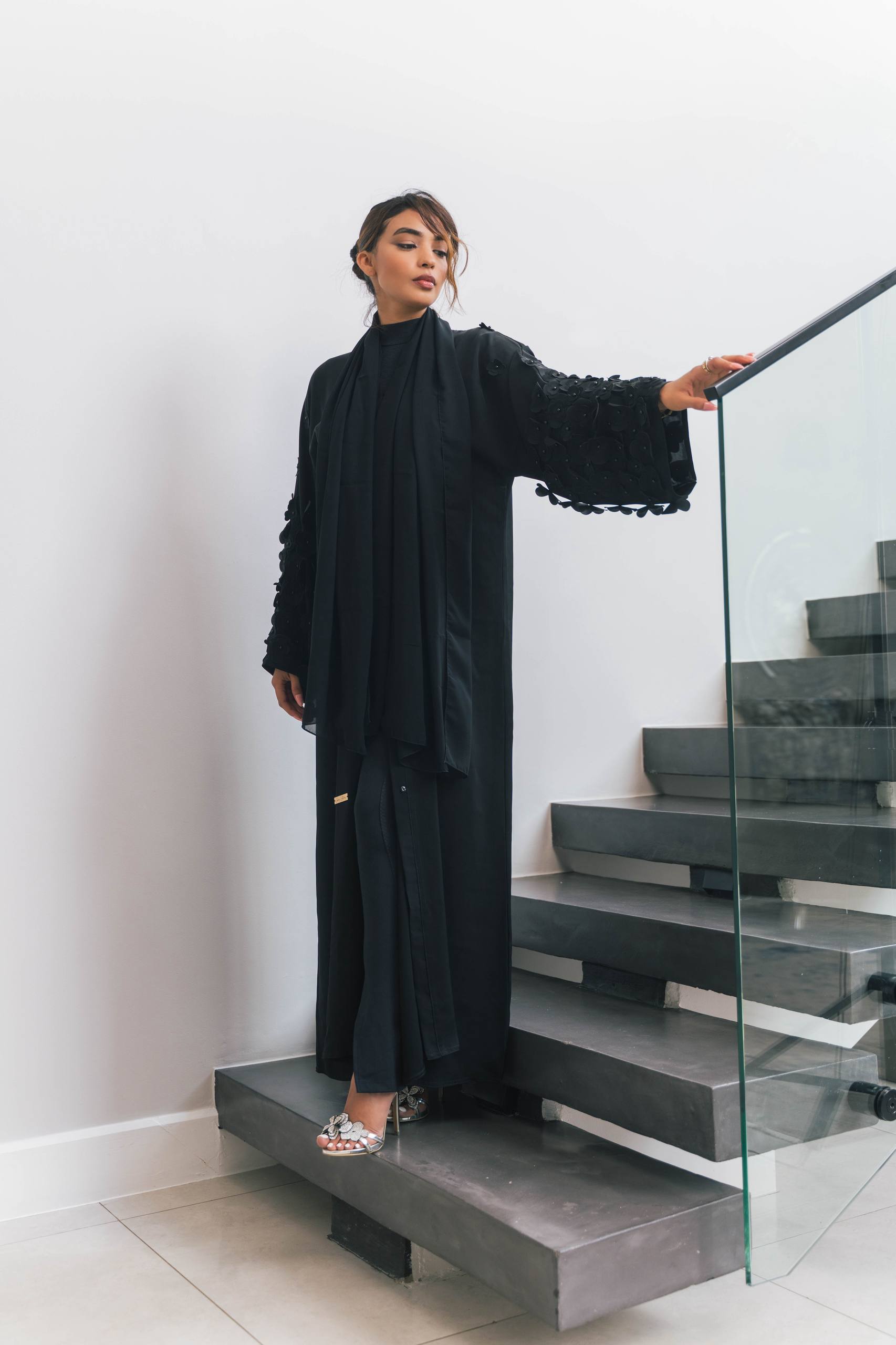 Textured floral appliqué adds dimension and a couture-inspired look without overpowering the simplicity of the abaya.