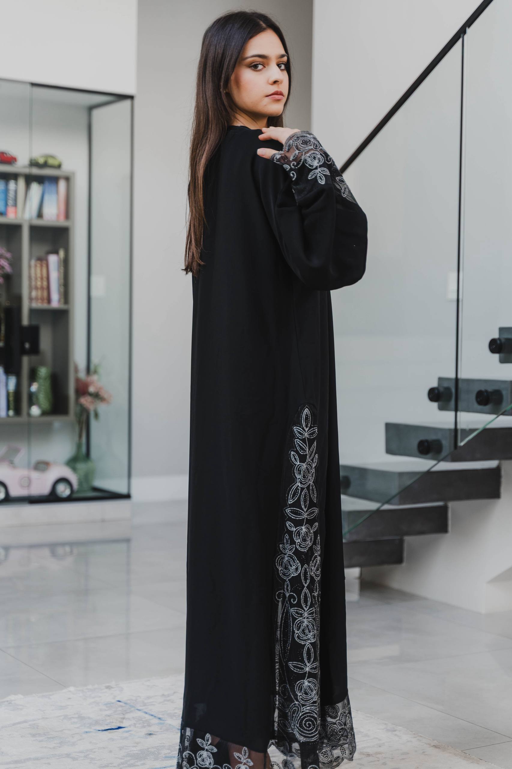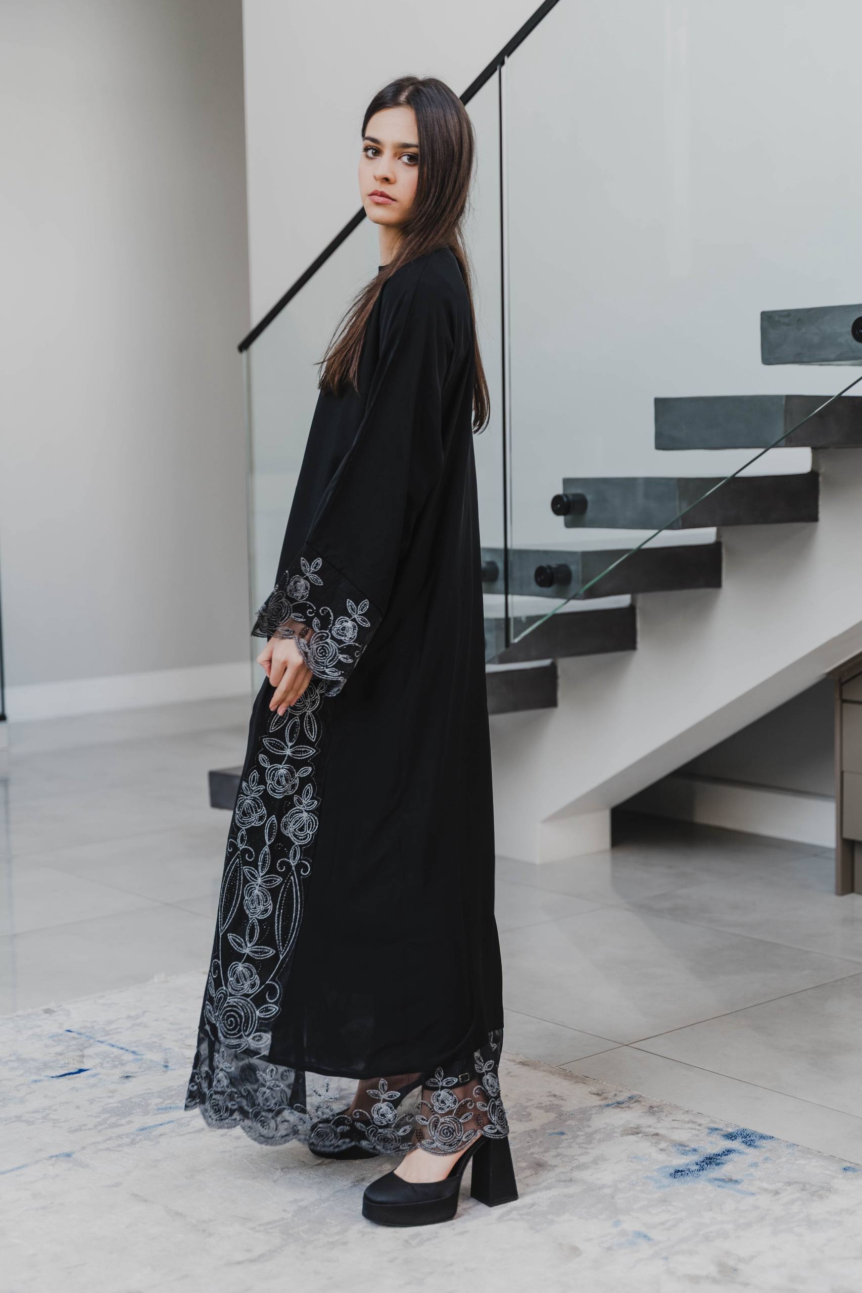Step into refined sophistication with this stunning black abaya, beautifully enhanced with silver floral lace adorning the sleeves and sides. Crafted for those who appreciate subtle luxury, this piece pairs timeless modesty with delicate feminine detailing.