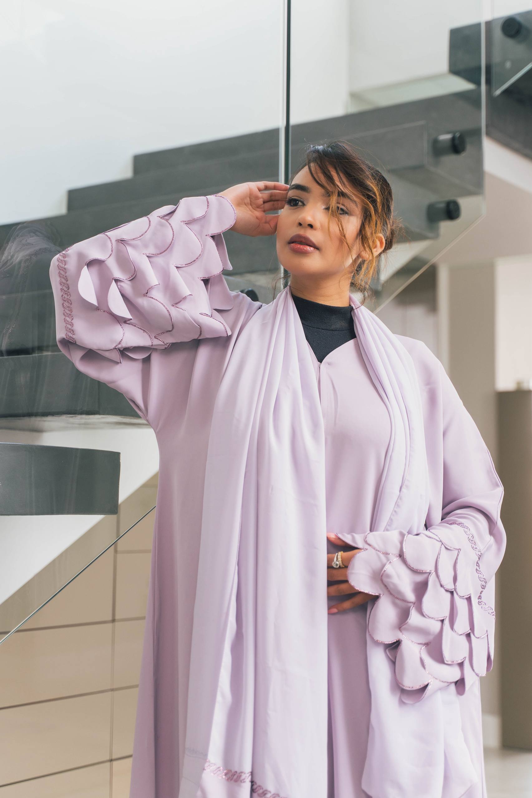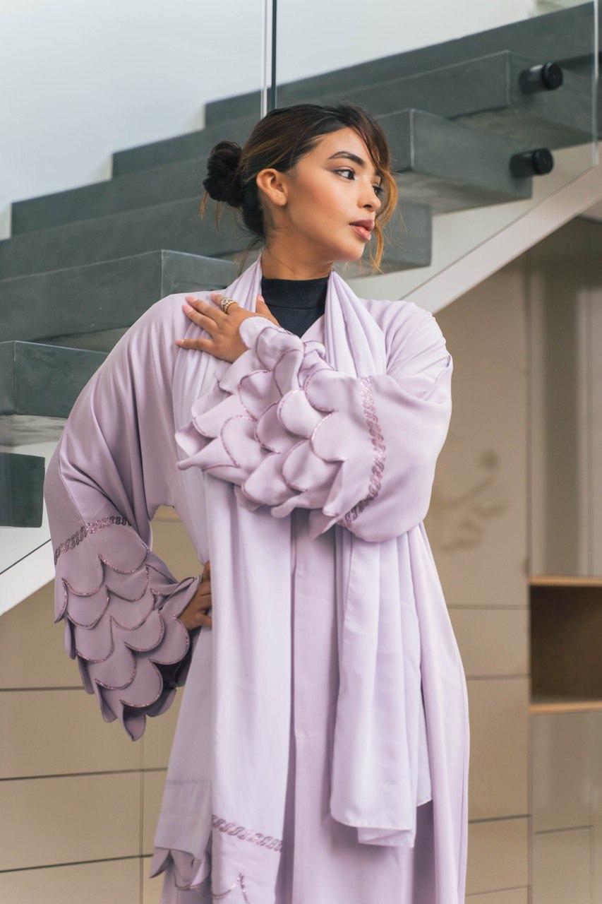 Graceful, feminine, and effortlessly refined-this abaya is crafted from premium Korean Nida fabric in a soft lilac hue, offering a beautiful blend of comfort and elegance. The standout feature lies in the intricate sleeve patterns, delicately enhanced with sparkling diamond accents that add subtle shimmer without overpowering the design.