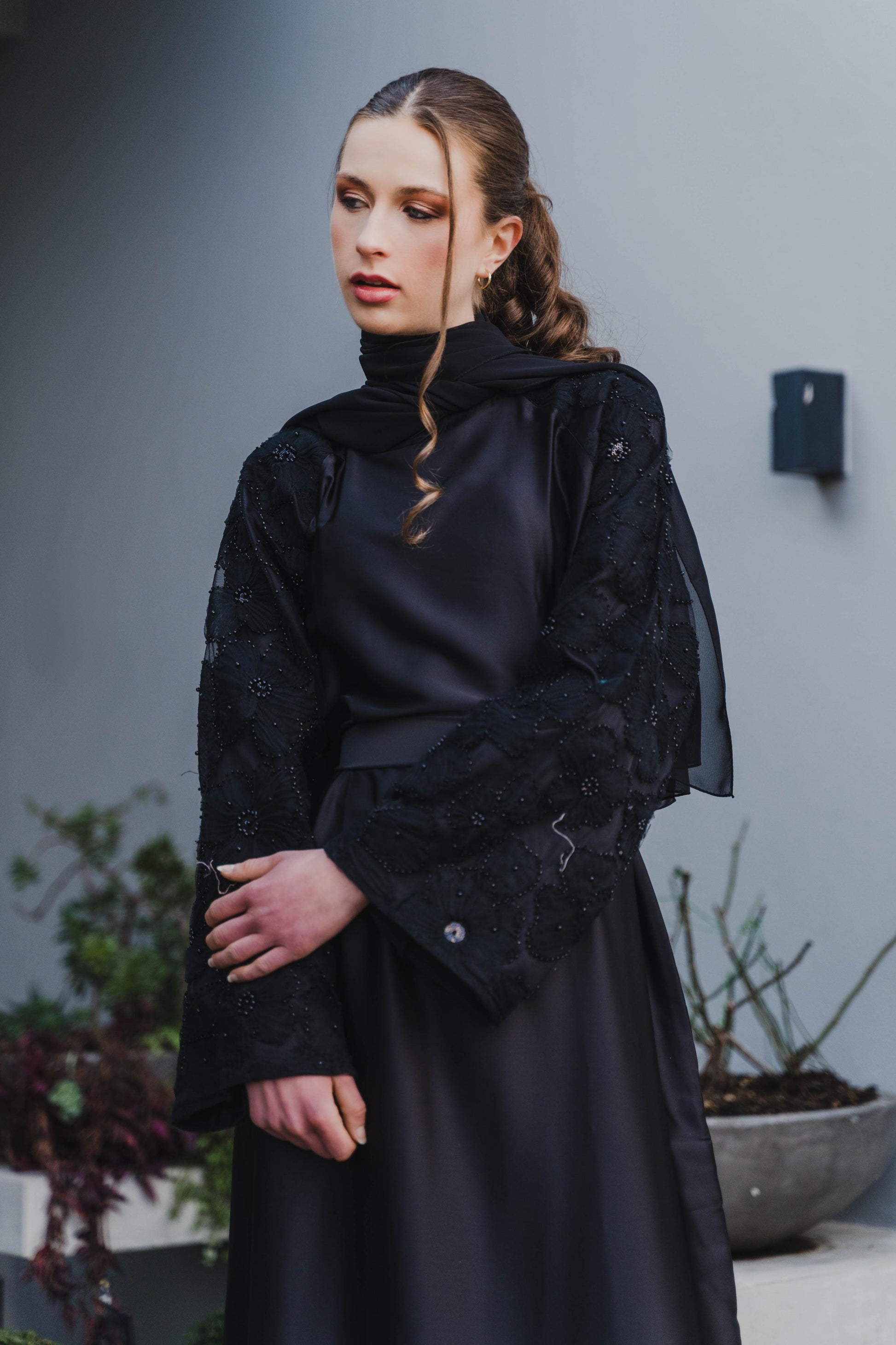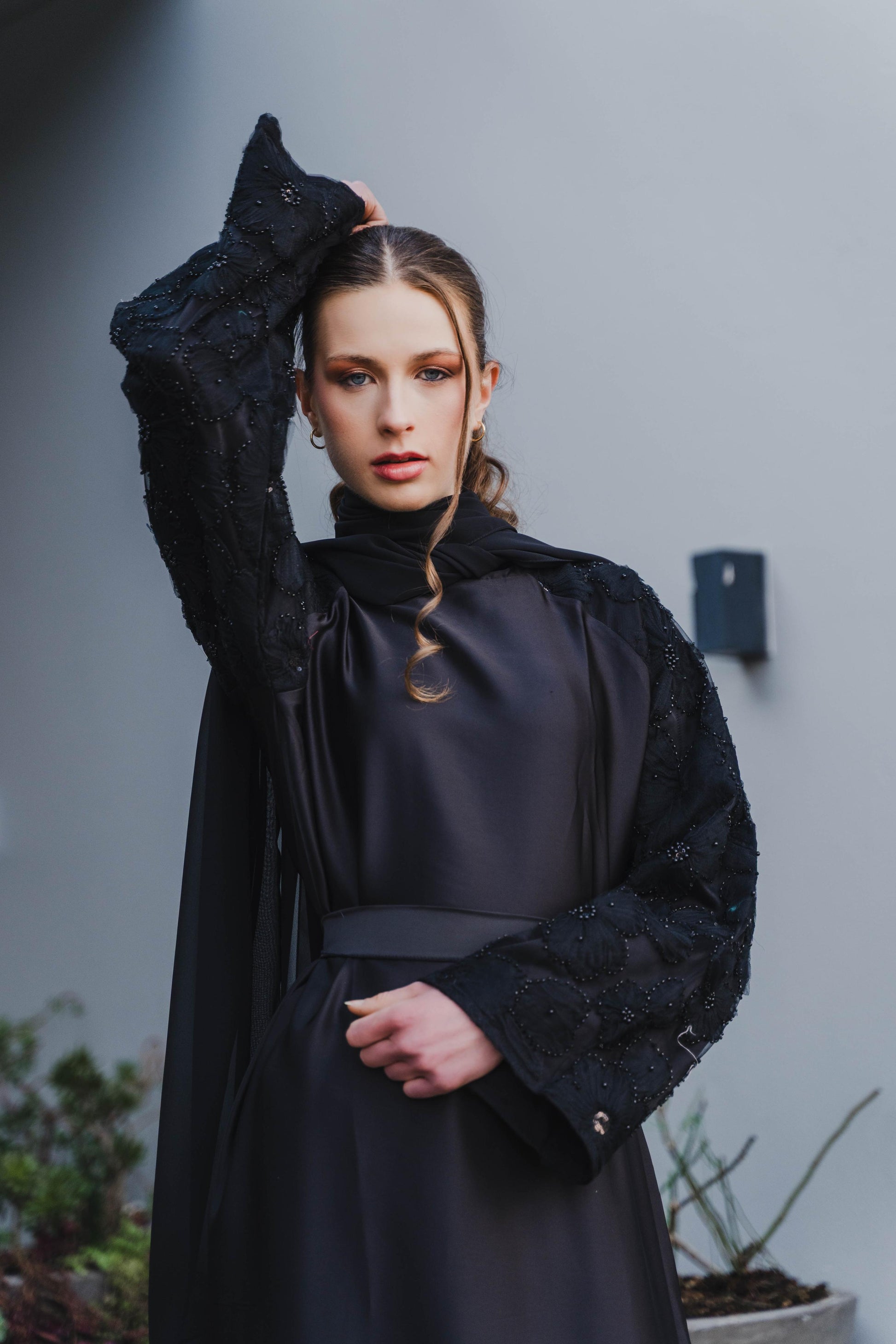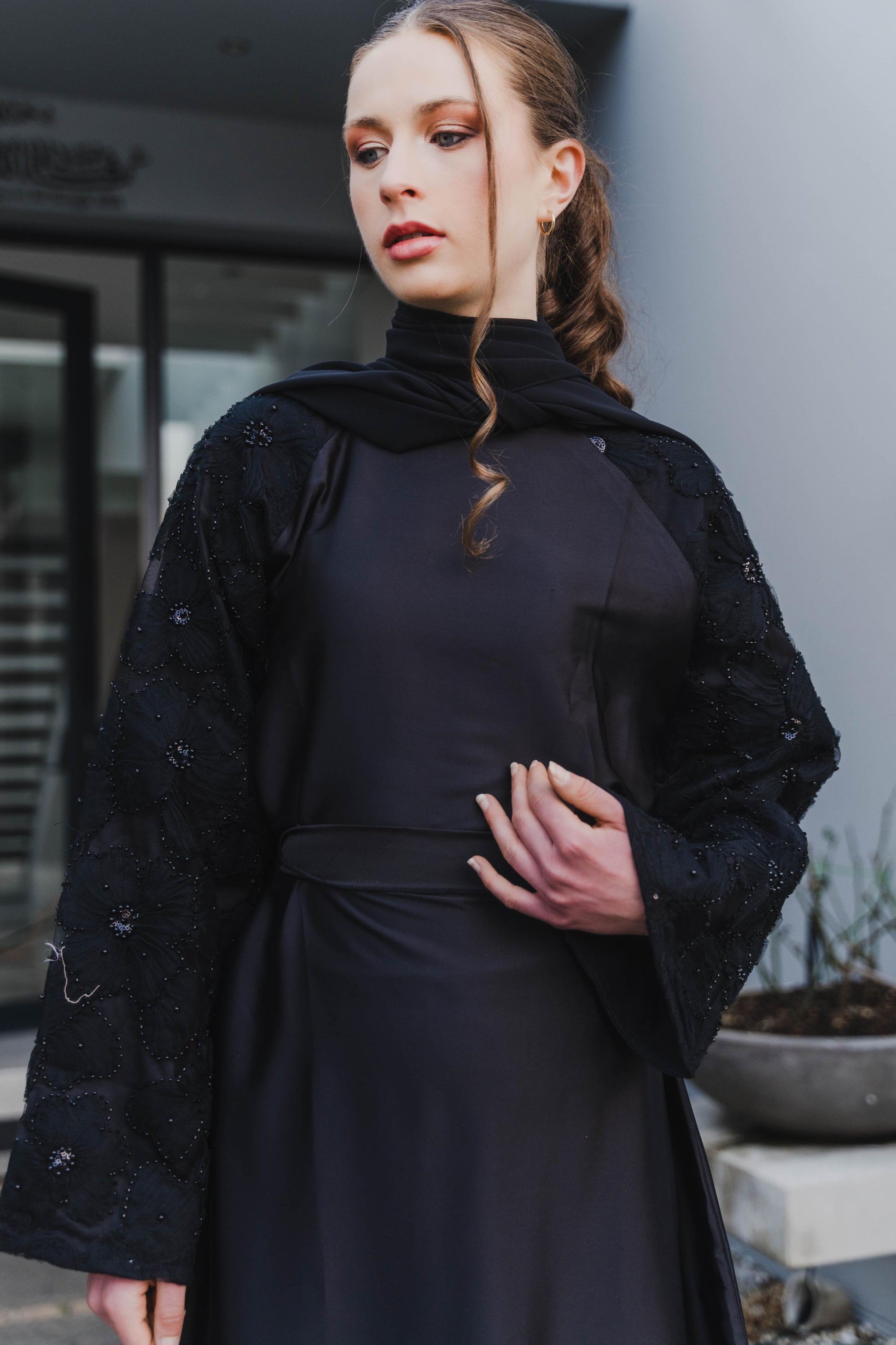 The full floral embroidery on the sleeves adds a touch of romantic luxury — each bloom delicately crafted to reflect the beauty of heritage artistry. The contrast between the deep black fabric and the floral details creates a captivating balance of strength and softness, making this abaya a true statement of elegance.