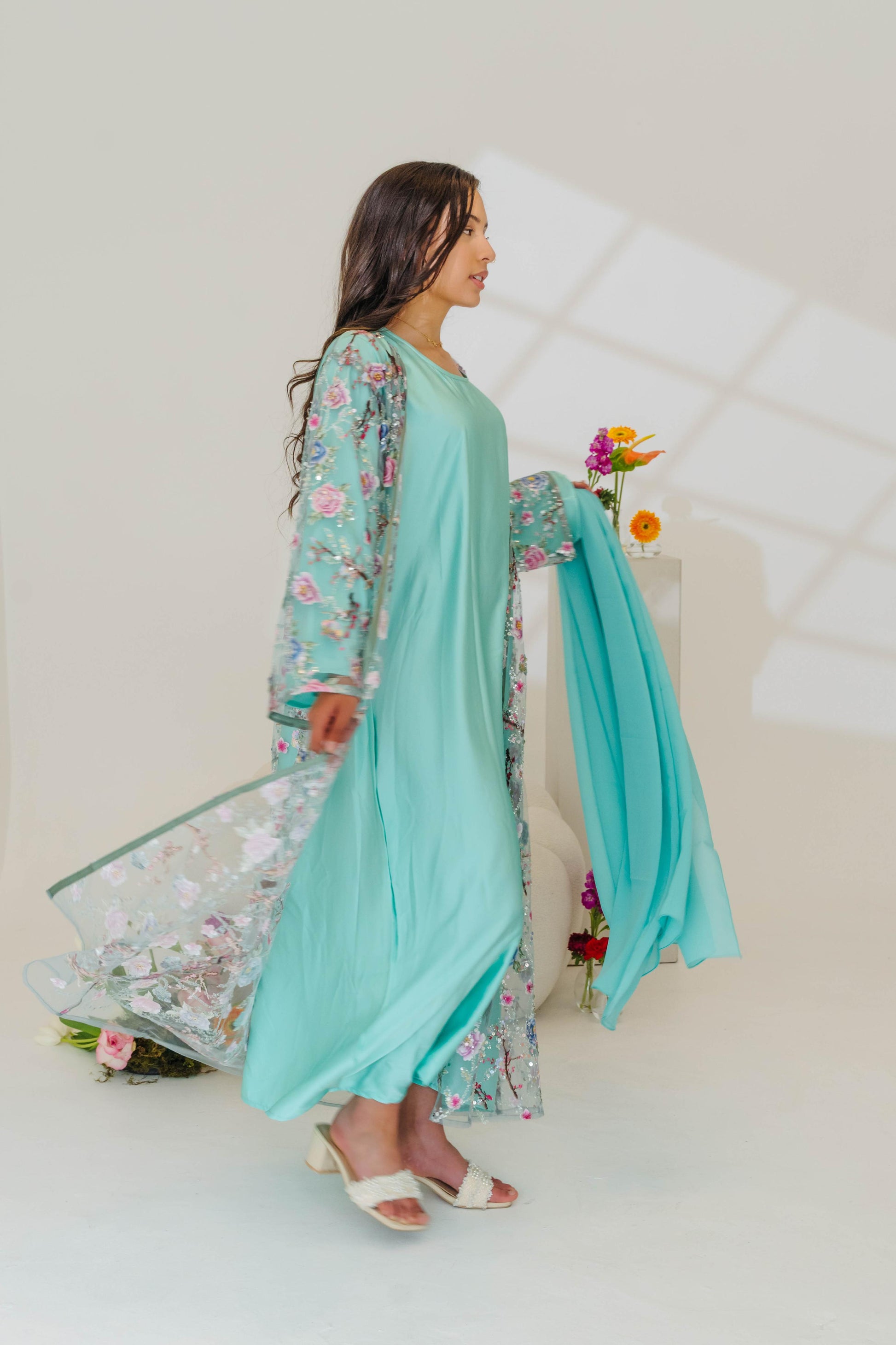 The delicate mint hue harmonizes beautifully with intricate floral patterns, creating a look thatโs both timeless and effortlessly feminine. Its fluid silhouette and impeccable tailoring reflect meticulous craftsmanship, offering a graceful flow with every movement.