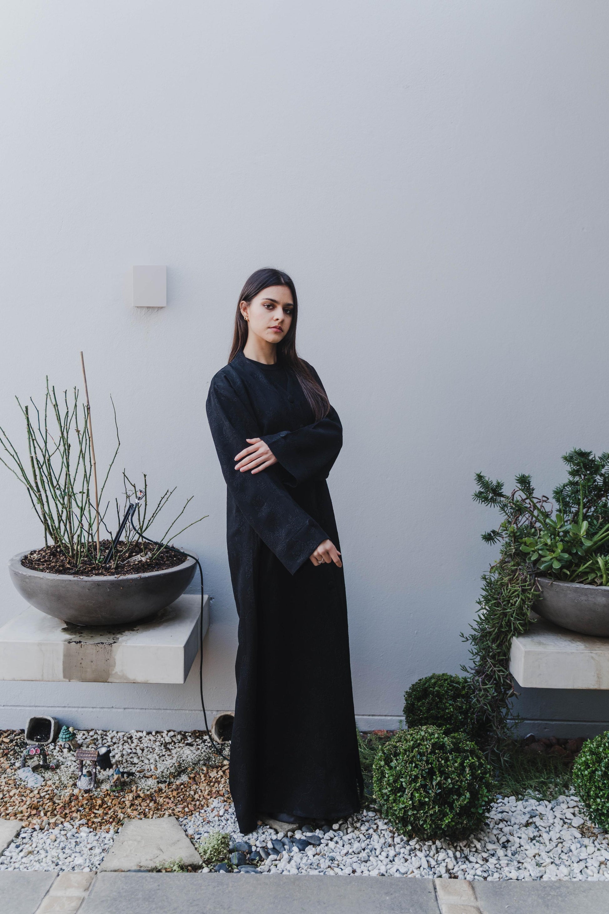 The subtle shine enhances the depth of the black, giving the fabric a luminous, dimensional finish that flows beautifully with every movement. Designed for women who carry their elegance with quiet confidence, this abaya transitions seamlessly from day to night, exuding refined opulence.