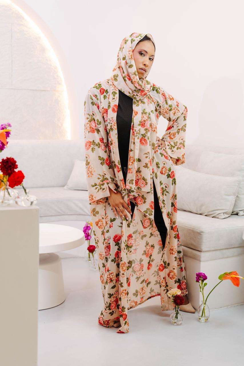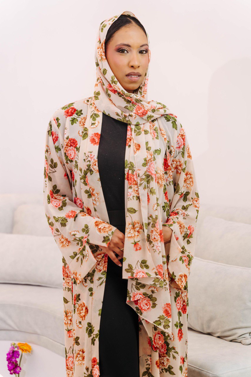 Floral Throw Abaya - Nude Blossom Edition (With Matching Scarf)