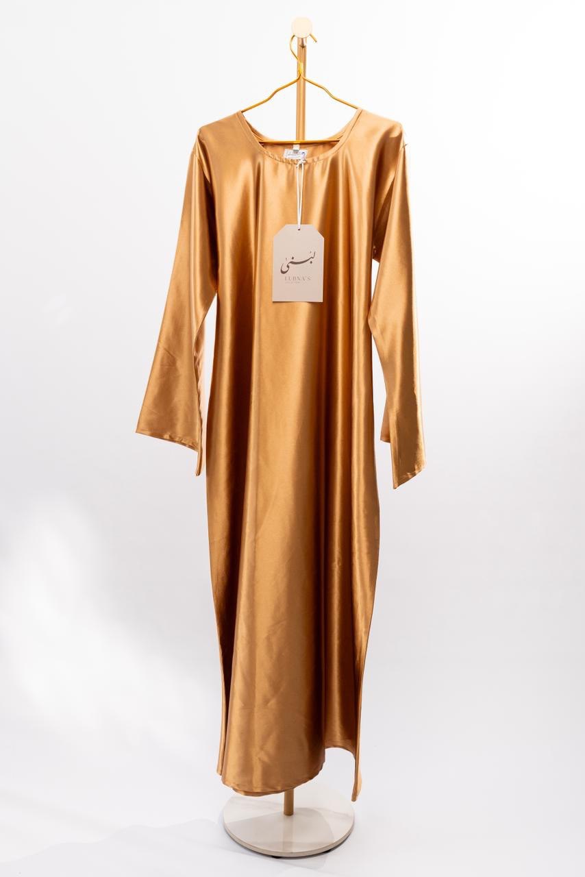 The rich gold tone adds a touch of opulence-perfect for weddings, evening galas, formal celebrations, or standout special occasions. Designed for modest sophistication, the dress features a sleek high neckline, long sleeves, and a flowing full-length skirt that glides with graceful movement. The signature triple-tie back provides adjustable comfort while adding a delicate, elevated detail.