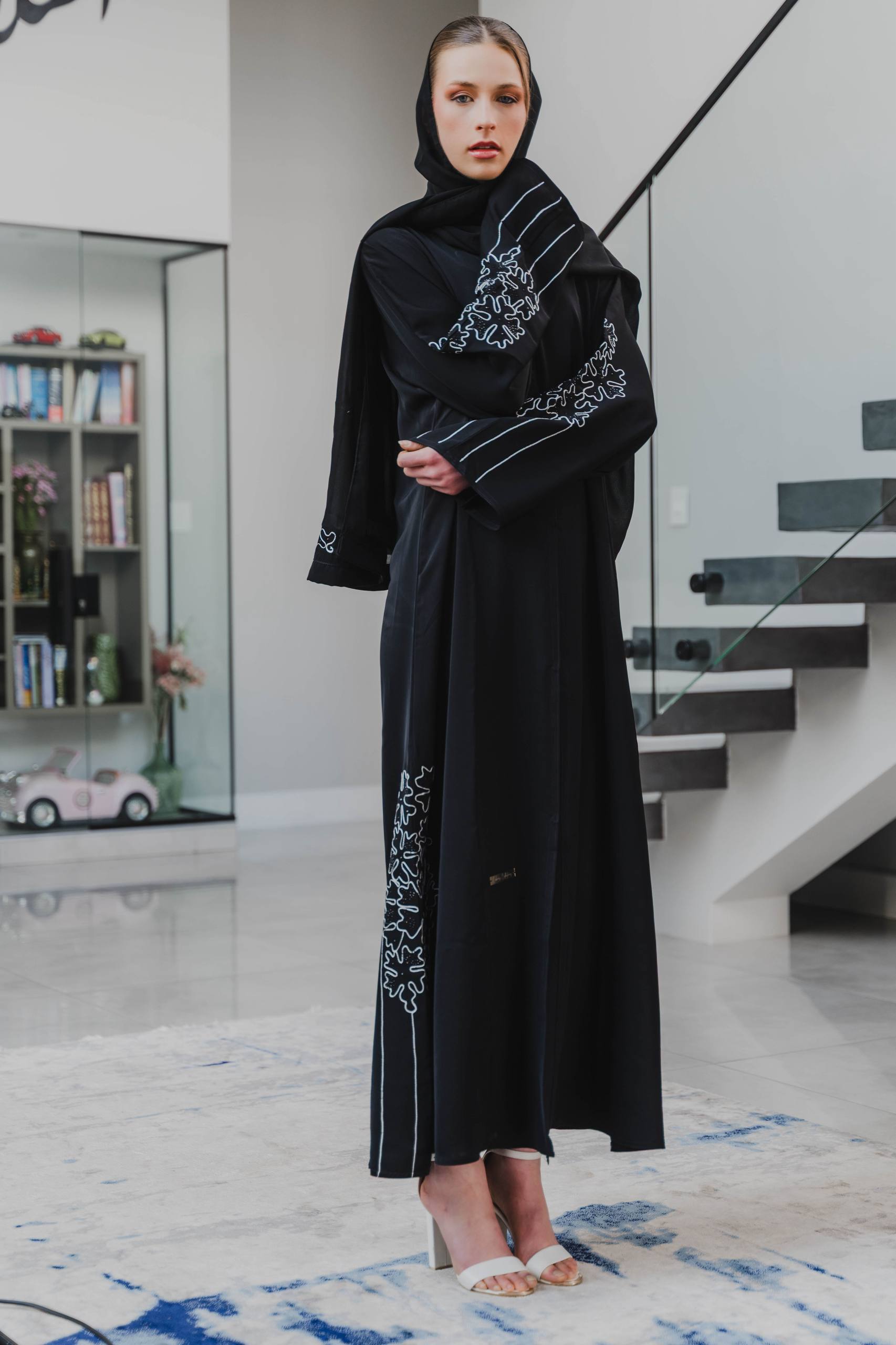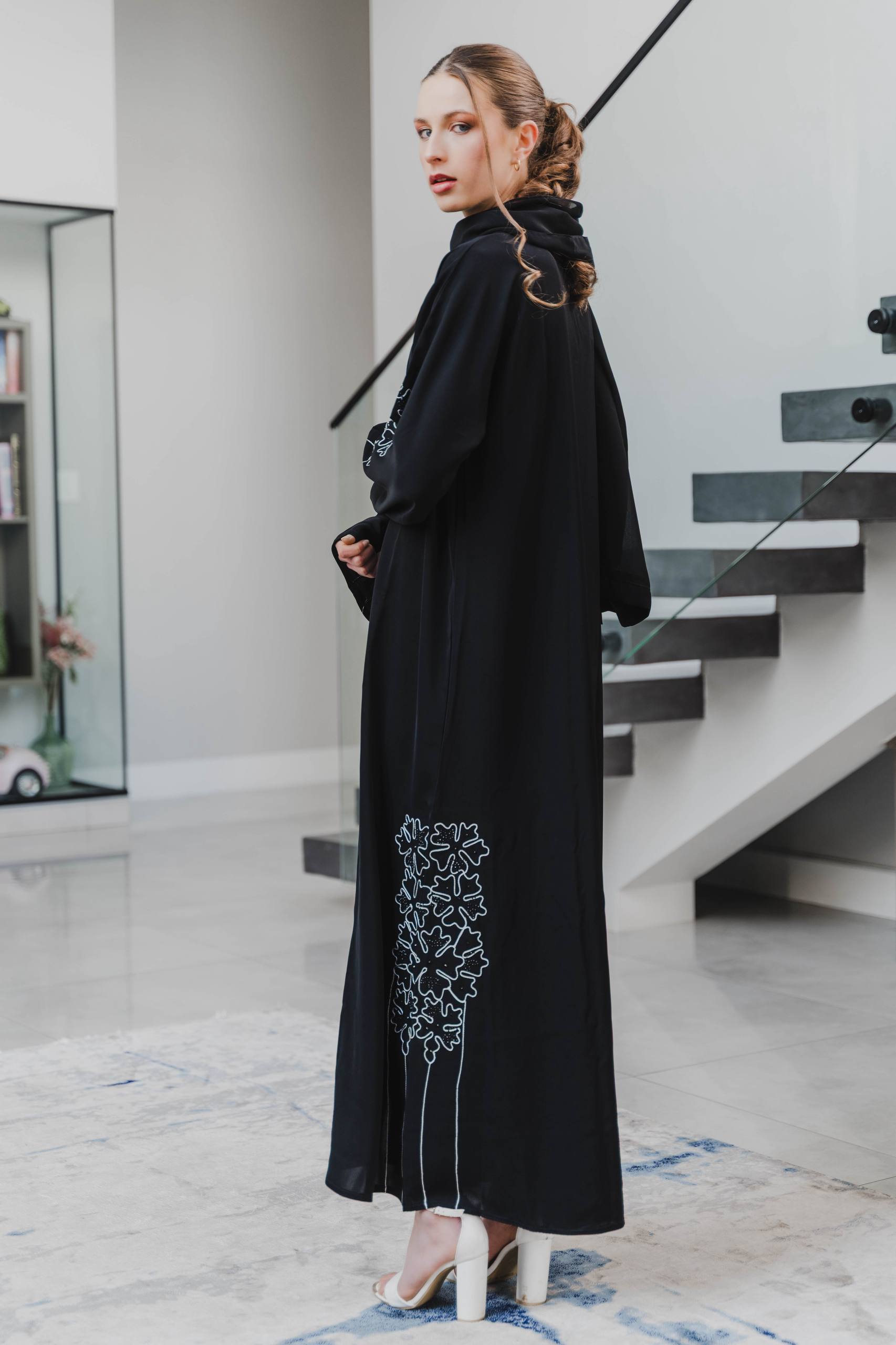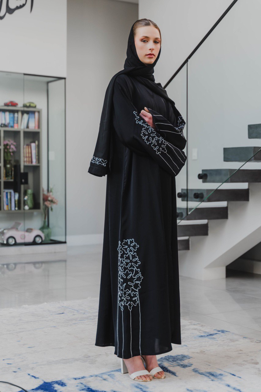 Step into refined elegance with this sophisticated black abaya crafted from premium Korean Nida fabric. Known for its soft, breathable feel and graceful drape, this fabric ensures all-day comfort without compromising luxury. The design is beautifully elevated with silver leaf detailing along the side, adding a touch of shimmer and modern artistry.