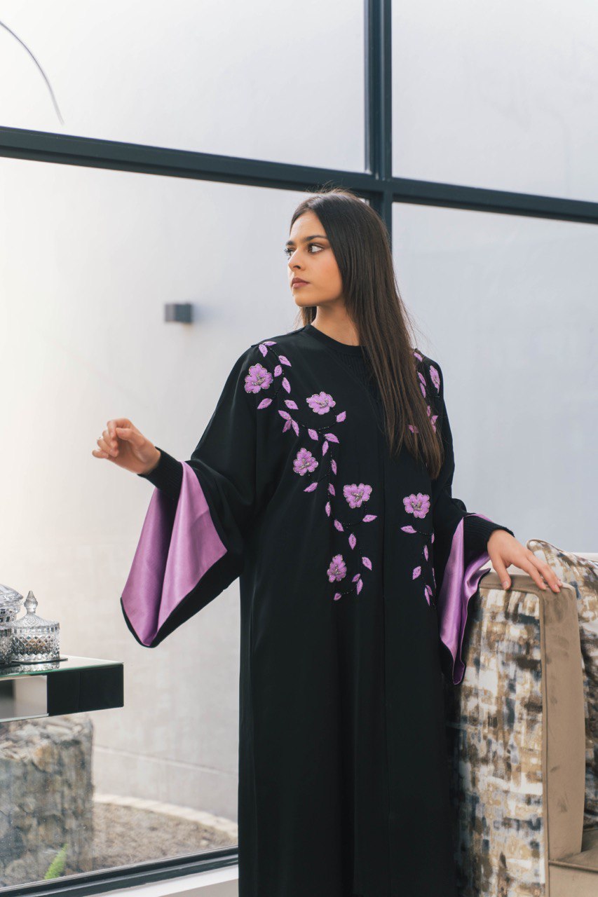with delicate purple floral embellishments, adding a subtle yet striking pop of color against the classic black base.