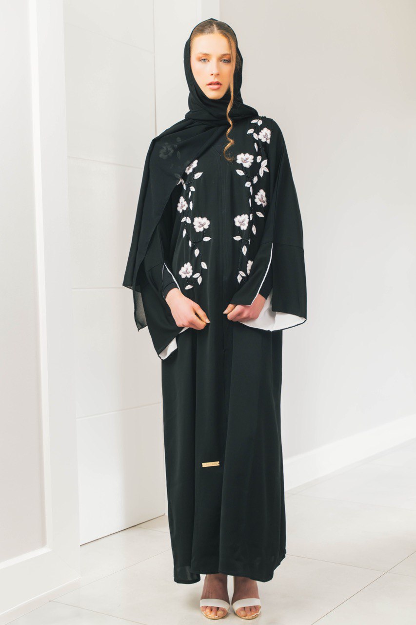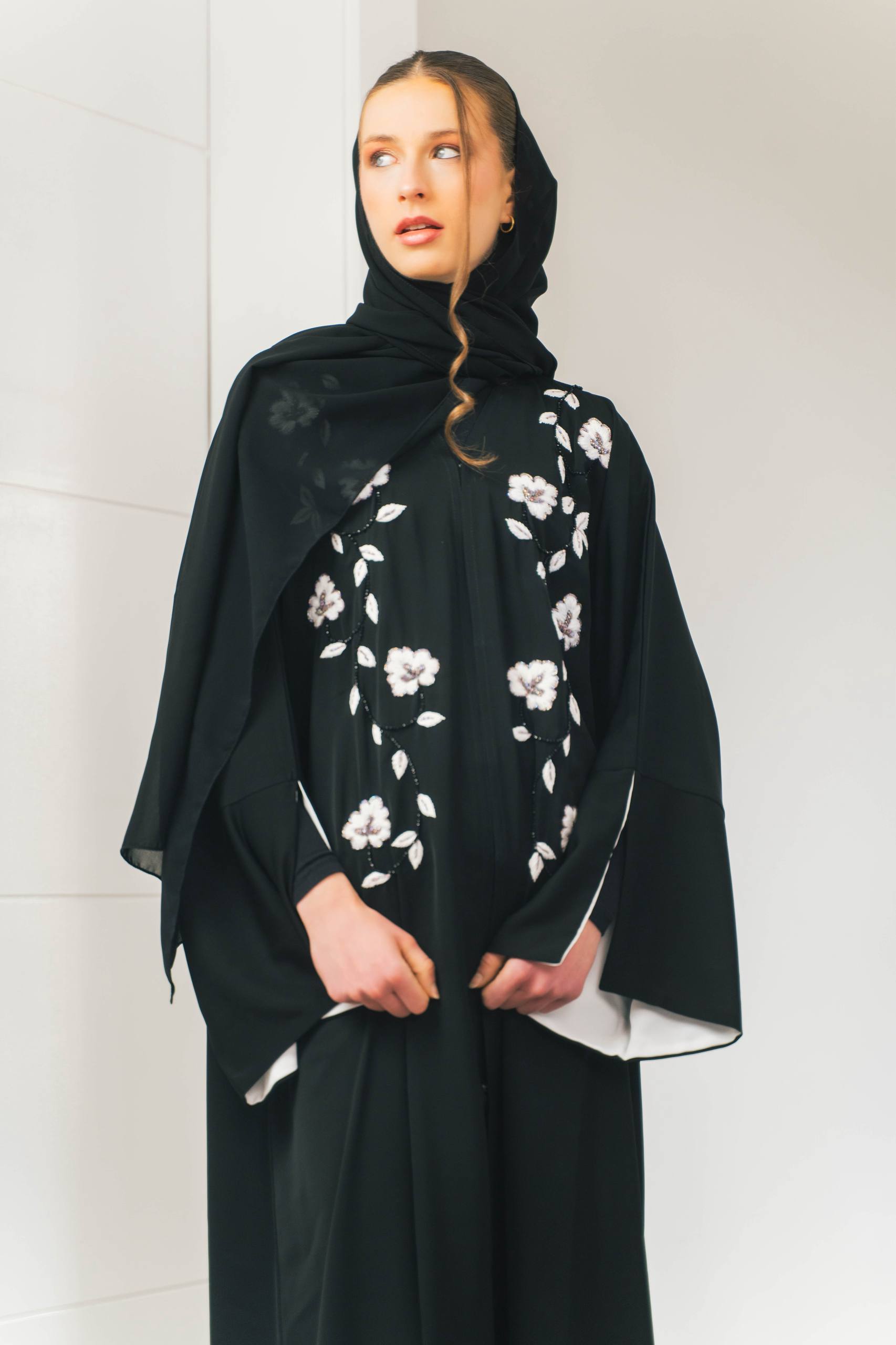 Refined, elegant, and effortlessly stylish this abaya is crafted from premium Korean Nida fabric, offering a smooth, breathable, and beautifully flowing silhouette. The design is elevated with white floral detailing around the neckline, creating a soft, feminine contrast against the deep black fabric. Perfect for both everyday elegance and special occasions.